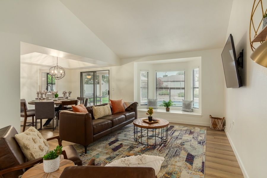 Step inside to a contemporary home with a comfy open concept living and dining room. The living room has seating for everyone including a window seat looking out to the backyard oasis. Catch a movie or sporting event on your big screen Smartv. The dining room seats 8 in the round and makes for a great conversation table. The remodeled kitchen has ample storage and everything you would ever need to prepare a meal or a BBQ. Just off the kitchen is the game room complete with a pool table and big screen Smartv. Gather for fun day or night.