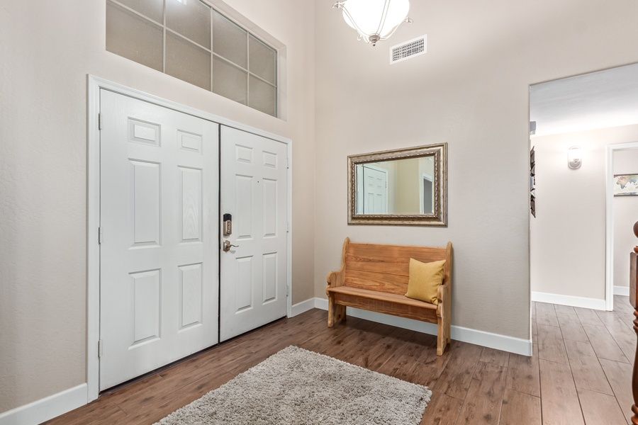Enter into this massive home with a gorgeous staircase. There are 2 living rooms and a hand out game room too. Lots of spaces to find time for togetherness or a quiet corner. Super comfy hang out game room with a grand sectional, large TV, games and a fun popcorn machine.