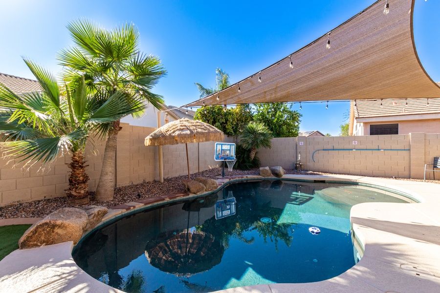Fabulous Chandler home away from home with a super cool Tiki Time backyard oasis. Have the family gather round the lagoon pool with games and fun for the whole family. This backyard oasis has a Tiki bar, BBQ, Fireplace and loungers for sunbathers and an outdoor living room for catching the sunrise with a cup of coffee or the sunsets with a glass of vino. This is a coveted south facing backyard too for optimal times in the Arizona warmth.