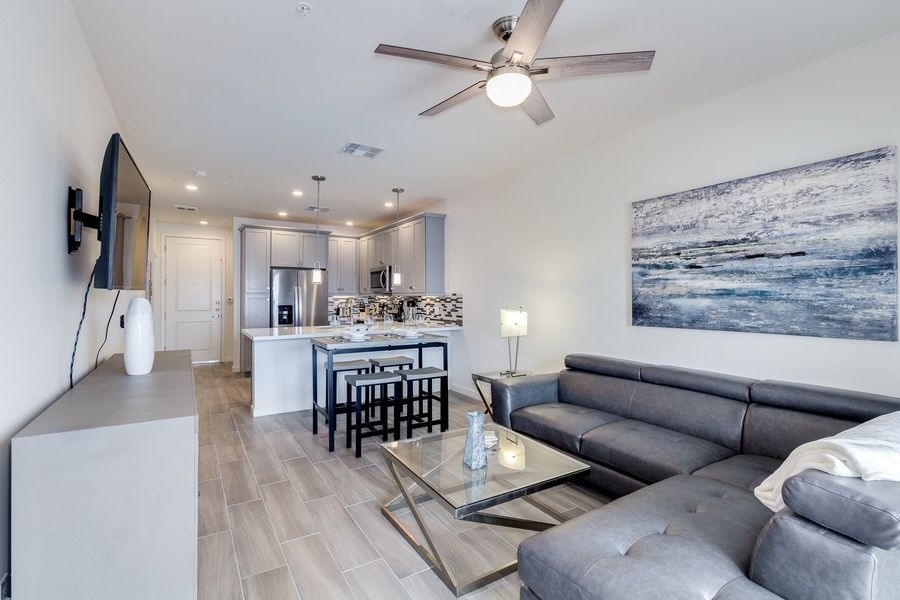 RESORT Condo. Highly Upgraded with a modern style. Resort Living, Security Building, Underground Safe Parking, perfect for the guest who wants to be inspired or who loves travel. Super easy access to 10, 202 and 101. 20 Minutes from Sky Harbor. Spacious one bedroom with King Bed and TV as well as a separate office space/sitting room. Master bath with double sinks and quartz counters, soaker tub, large walk-in closet. Open Floor Plan kitchen with quartz breakfast bar and overlooking a great living room. Separate 1/2 bath and full laundry room. Balcony with water views. Perfect morning sun and afternoon shade for sitting out. Resort Pool, Gym, Yoga and Movement Studio. Clubhouse featuring a kitchen, business center shuffleboard, pool and more. HEATED Resort Pool, spa, fire pits, outdoor kitchens, and cabanas. The Cays is a choice for the discriminating guest. This is brand new. Barely ever used. Walking paths along the water, restaurants just steps away, perfect for meeting friends and for making new friends. Feels like home.