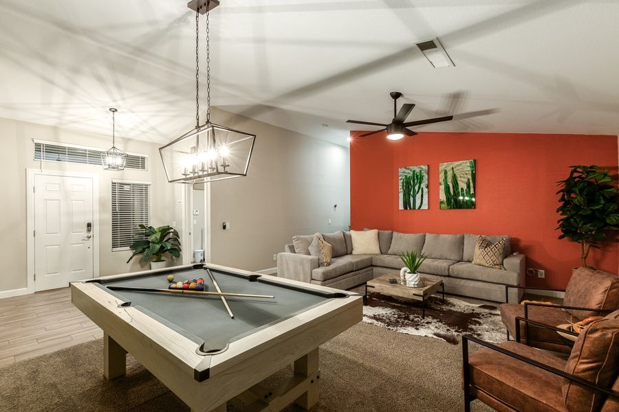 The game room and kitchen look onto the resort backyard.