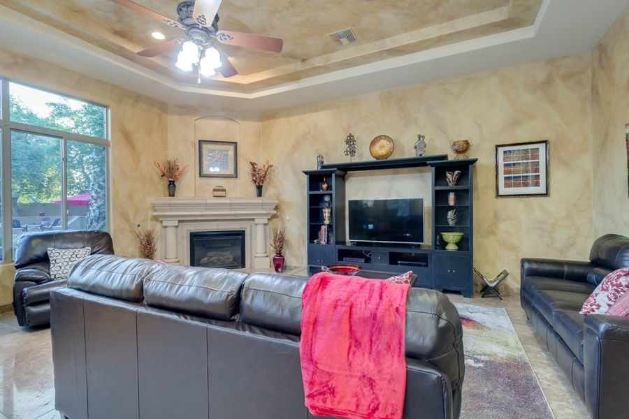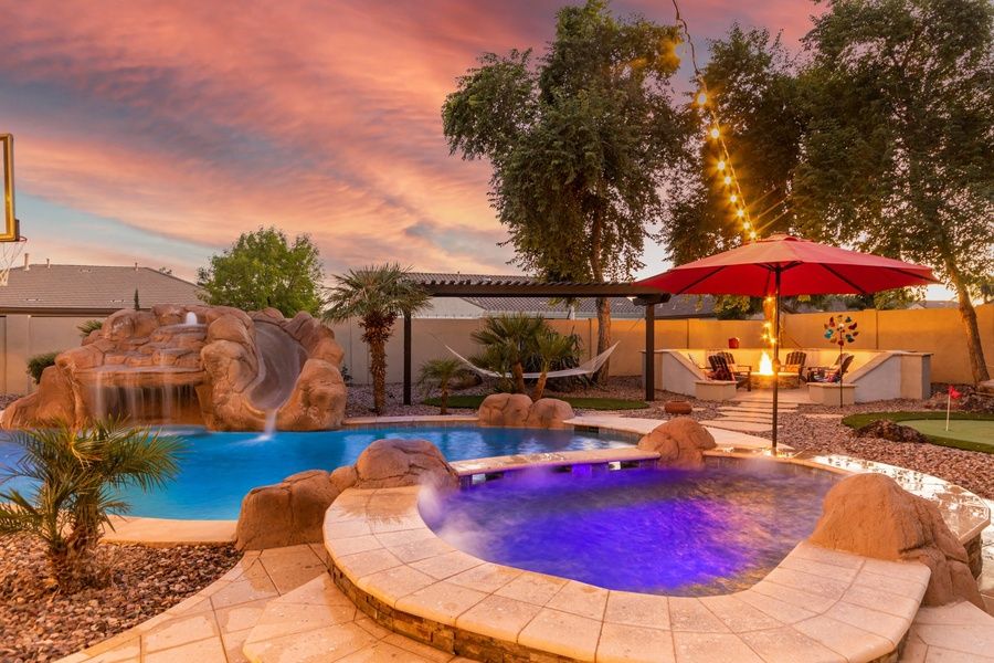 Welcome to your Tuscan Dream Vacation Home! This luxurious 4000 sq ft estate offers unrivaled amenities for the entire family. Enjoy five bedrooms, each with its own en-suite bathroom, perfect for hosting large groups or a multi-generational getaway. The open concept of the kitchen and family room features plenty of space to gather around the gas fireplace - creating an unforgettable ambiance reminiscent of a Tuscan villa. But that's not all this house has to offer - there's also an amazing game room complete with board games, pinball machine, ping pong table, foosball and air hockey tables that are sure to keep everyone entertained throughout your stay. And if you need some time away from it all? The office off the game room provides a peaceful spot for work or study - ideal for those who need some quiet time during their vacation. When you're ready to get outside and soak up the sun (or just enjoy some fresh air), step out onto the resort backyard oasis! With its heated pool featuring a spa and grotto waterfall plus rock slide - this outdoor living area will have everyone in awe as they relax in their own private paradise. So don't wait any longer; come experience true Tuscany living at this one-of-a-kind vacation rental today! Woof! This house is dog friendly. $25 per night for 1 dog maximum. Located in Metropolitan Phoenix, Chandler embodies an active lifestyle with easy access to outdoor recreation with endless family-fun, award-winning events, world-class golf facilities, and a vibrant downtown. Chandler visitors will enjoy the diverse community with its fabulous restaurants of every cuisine, premier shopping, arts and culture and a wide range of things to do all year-round. Come disconnect and discover more in Chandler. Enjoy live performances by the Chandler Symphony Orchestra or partake in the food and cultural festivals. Activities abound, whether it is shopping at the Chandler Fashion Mall, Baseball Spring training, NASCAR, IRONMAN triathlon training, or cruising the 327 miles of bike lanes and paths, there is something for everyone here...and Oh, by the way, did we mention the golf? Chandler is a GOLFERS PARADISE. There are many courses, but of special note guests can play at the 27 hole Ocotillo Golf Club, pro shop and restaurants. This fantastic resort is owned by Phil Michelson and offers rolling hills and tree-lined fairways that is a great alternative to the typical desert courses in the area. The amenities and facilities are awesome and compare to many of the private clubs in the area. Ocotillo is recognized as one of the finest daily fee facilities in the country and routinely receives 4-star ratings from Golf Digest's annual guide. It was also voted as one of the “Three Must Play” courses in the area including Troon North and the Boulders...pretty good company! This home and vacation experience is sure to wow you. Book today. SPLASH. This home is equipped with a gas heated pool and pool heating is optional. The cost for pool heat is $65 per day. Should the home be equipped with a spa or hot tub, the cost to heat the spa or hot tub is included in the rental amount year round. City Code Enforcement: As part of our commitment to being good neighbors, occupancy limits and quiet hours (9pm-8am) are strictly enforced. No speakers or sound systems will be provided for use in our properties. Violation of any noise ordinances will be subject to fines that can reach up to $10,000 per violation. Events or parties are not allowed without prior written approval and an additional fee. Any unauthorized parties or events will be shut down and a fine will be assessed. Please inquire for more information about our event policies and fees. Accidental Damage Protection: A non-refundable accidental damage protection plan has been included in the price of your reservation. Under this plan, you will not be held responsible to pay for accidental damage or loss to the rental property resulting from you or others in your party up to $3000. This plan does not cover intentional acts of a guest, gross negligence, or willful and wanton conduct, and/or damages caused by pets. This is a smoke-free property. Violation of the no-smoking policy will result in forfeiture of the security deposit, a $300 smoking fee, and liability for any fire or property damage costs. Air Conditioning: Please note A/C cannot go below 70 degrees as this freezes out the units and causes issues. For stays of over 30 nights, an electricity cap has been determined as presented in your rental agreement. 24/7 Care for our Guests. We are always available to you through text and phone, as well as 24 hour Concierge Service! We report and prosecute all Credit Card Fraud. Arizona Transaction Privilege License #: 21140638 Short Term Rental License #: 305383 Elite Vacation Rentals has engaged VacayHome to ensure this listing contains all the information you need and that it is easy for you to book via search engines & online channels. VacayHome is connected directly to the property management system used by Elite Vacation Rentals which ensures that availability & rates are up-to-date & accurate. When you book, VacayHome processes payment on behalf of Elite Vacation Rentals and a charge will appear on your statement as "VacayHome". VacayHome will send you a confirmation e-mail that contains all the information you need to prepare for your vacation including arrival instructions. VacayHome has a 24 x 7 team to assist you with any questions or concerns you may have prior to arrival. To access VacayHome, obtain the customer support telephone number or read FAQs, please click on the links at the bottom of this page.