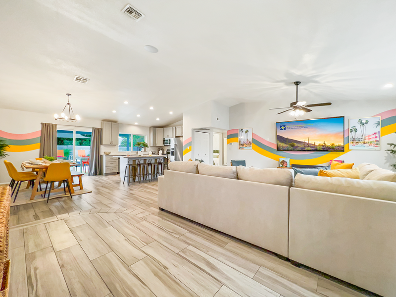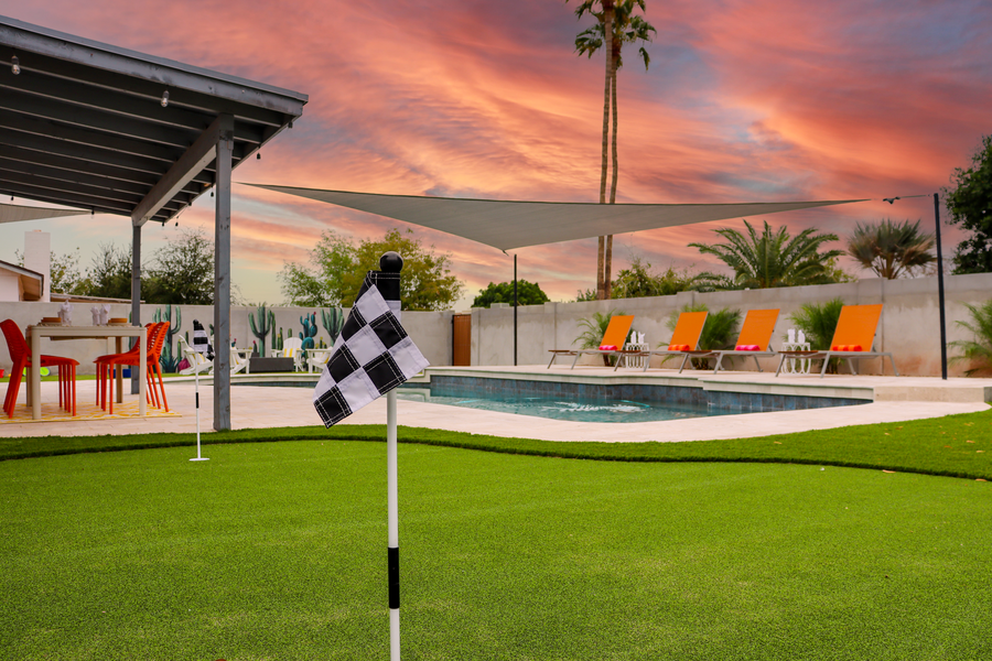 Welcome to your oasis in the heart of Chandler! This Palm Springs Retreat-themed home is the epitome of luxury and relaxation. Boasting three bedrooms and two baths, this newly remodeled gem offers a generous living space for you and your loved ones to unwind and create lasting memories. Step into the backyard and be greeted by a large heated pool, perfect for those warm Arizona days. The expansive deck provides plenty of room for sunbathing, while the putting green offers a fun and challenging opportunity for golf enthusiasts. Gather around the fire pit with your favorite beverage as the sun sets, and take in the breathtaking Arizona sunsets. Impress your friends and family with your grilling skills on the gas BBQ, conveniently located just steps away from the outdoor dining area. Indulge in the open-concept living area, with a super large television and sound system that will make you feel like you're in your private theater. The north-facing orientation ensures abundant natural light throughout the home, while the split floor plan provides privacy and tranquility. Need a designated workspace? Look no further! This home features a dedicated workspace perfect for professionals or students who require a quiet area to focus on their tasks. Each bedroom has a television, allowing you to unwind and catch up on your favorite shows from the comfort of your bed. The master suite features a luxurious en-suite bath, providing a spa-like experience in the privacy of your own home. Outdoor enthusiasts will appreciate the 2-car garage and driveway, providing ample parking space for all your vehicles. Additionally, street parking is available for your convenience. Located just minutes from downtown Chandler, you can access fantastic shopping, dining, and entertainment options. This vacation home has it all! Enjoy the convenience of an inside laundry room and a sizeable eat-up breakfast bar that will indeed become the heart of your home. Don't miss out on this incredible opportunity to vacation in paradise. Book today and be prepared to fall in love with this Chandler Vacation gem! DOWNTOWN CHANDLER You're so close to Downtown Chandler. Downtown Chandler is a vibrant district known for its modern Chandler Center for the Arts, an array of boutiques, and colorful street art. North Arizona Avenue is a haven for shops, businesses, hip brew pubs, diverse eateries, and its tree-lined namesake park and artwork at the famous Vision Gallery. It borders the San Marcos Golf Course and is 4 miles from the sleek Chandler Museum. Elite Weather Pool Heater Guarantee: Splash. Thinking of booking November-April? The weather in Arizona can be quite volatile this time of year. There may be soaring heats over 100 degrees or temps that can drop below 50 degrees. This home is equipped with a heat pump, reel and cover. The heat pump that is responsible for heating the pool is at full efficiency if the weather stays above 50 degrees allowing the pool to get to a comfortable swimming temp of 85 degrees. Rest assured; we are looking out for you. Should you want the pool heated, please book with that option now. The pool heat fee is optional, but please let us know if it is your intention to swim. As your reservation date approaches, we will be in touch should we find the temps heading below 50 degrees (approximately 1 week before arrival) and you can make a final decision if you wish the pool to be heated based on weather conditions. We can refund the pool heat fees should you be concerned about not being able to enjoy this amenity as intended. This pool is equipped with a heated pool and pool heating is optional. The cost for pool heat is $65 per day. Should the home be equipped with a spa or hot tub, the cost to heat the spa or hot tub is included in the rental amount year round. City Code Enforcement: As part of our commitment to being good neighbors, occupancy limits and quiet hours (9pm-8am) are strictly enforced. No speakers or sound systems will be provided for use in our properties. Violation of any noise ordinances will be subject to fines that can reach up to $10,000 per violation. Events or parties are not allowed without prior written approval and an additional fee. Any unauthorized parties or events will be shut down and a fine will be assessed. Please inquire for more information about our event policies and fees. Accidental Damage Protection: A non-refundable accidental damage protection plan has been included in the price of your reservation. Under this plan, you will not be held responsible to pay for accidental damage or loss to the rental property resulting from you or others in your party up to $3000. This plan does not cover intentional acts of a guest, gross negligence, or willful and wanton conduct, and/or damages caused by pets. This is a smoke-free property. Violation of the no-smoking policy will result in forfeiture of the security deposit, a $300 smoking fee, and liability for any fire or property damage costs. Air Conditioning: Please note A/C cannot go below 70 degrees as this freezes out the units and causes issues. For stays of over 30 nights, an electricity cap has been determined as presented in your rental agreement. 24/7 Care for our Guests. We are always available to you through text and phone, as well as 24 hour Concierge Service! We report and prosecute all Credit Card Fraud. Arizona Transaction Privilege License #: 21525627 Short Term Rental License #: Elite Vacation Rentals has engaged VacayHome to ensure this listing contains all the information you need and that it is easy for you to book via search engines & online channels. VacayHome is connected directly to the property management system used by Elite Vacation Rentals which ensures that availability & rates are up-to-date & accurate. When you book, VacayHome processes payment on behalf of Elite Vacation Rentals and a charge will appear on your statement as "VacayHome". VacayHome will send you a confirmation e-mail that contains al