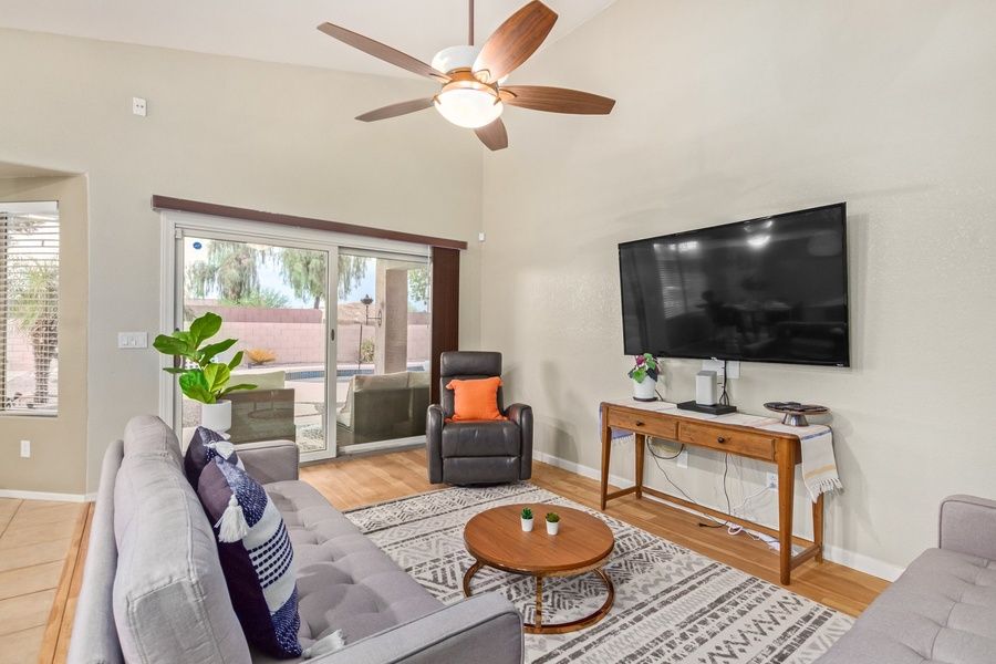 This extra special home in Chandler Arizona has a sparkling pool for lots of summertime outdoor fun. Step inside to a large living and dining space with an office that doubles as a game room off to the right. The office has doors so this is a private space for those that need to work from home.