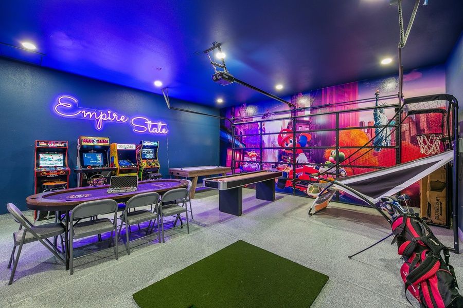 Welcome to the New Empire State Waterslide Retreat! An amazing destination for families and friends seeking a fun and relaxing getaway. Our home is designed to accommodate large groups and has everything necessary to create the perfect vacation experience. This lovely one-story Tuscan style home has 7 bedrooms, 6 full baths (5 bedrooms with ensuite) at 3,600+ sq ft. Situated in a significant part of town within a gated community, providing complete privacy and more than enough space.
