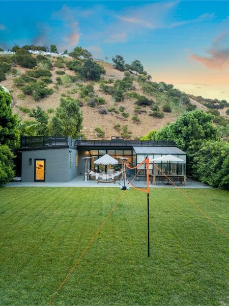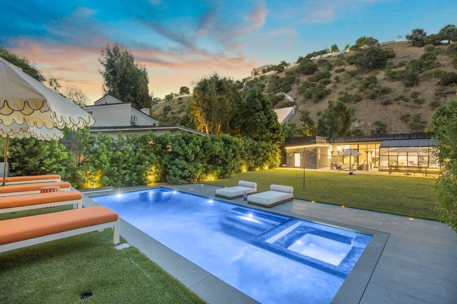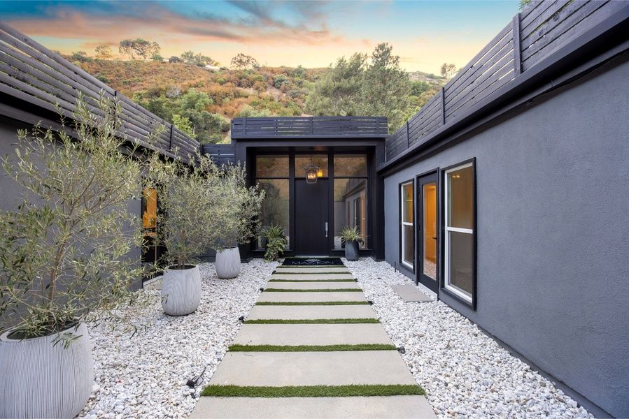 This modern estate features a private courtyard entry w/ ample room for entertaining, an inviting foyer opening to a floor-to-ceiling glass living room, large atrium-style office & an expansive, grassy backyard. The primary suite is beautifully appointed with fireplace & walk-in closets, en-suite bathroom with tub, glass shower & sauna, as well as direct access to the outdoor lounge area. Spacious guest bedroom adjacent to primary includes large closet space & bathroom with glass shower & tub. The upgraded kitchen beams with natural light & leads to the charming dining area & third bedroom with en-suite bath. A massive backyard retreat with space for entertaining, lounge & play - along with a stunning triple waterfall pool/spa & separate hillside back entry with street parking. Moments from Beverly Hills, Sunset Blvd shopping & dining and with easy access to Franklin Canyon hiking trails.