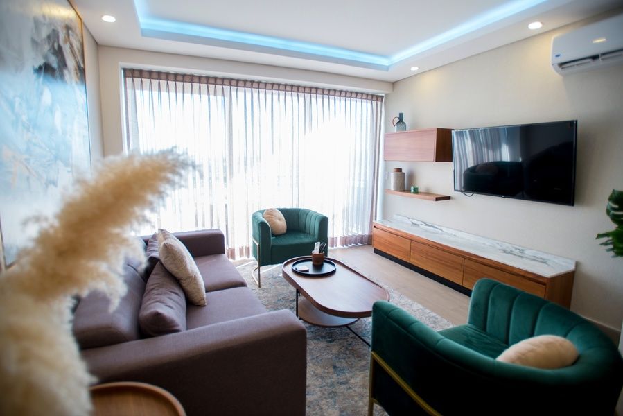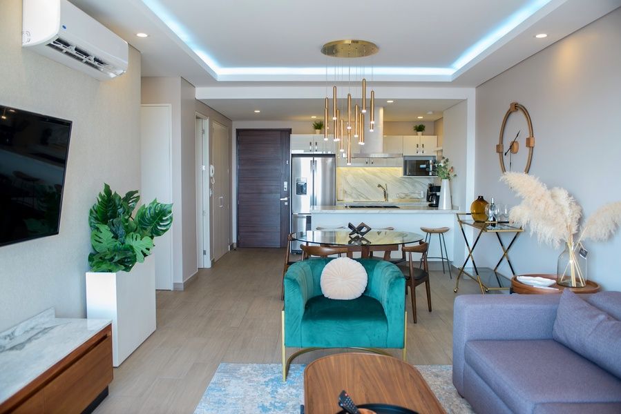 This unit is equipped with WiFi, Smart TVs, A/C, a laundry room, a fully equipped kitchen, and a furnished balcony to relax during the afternoon sunset.