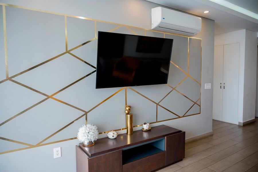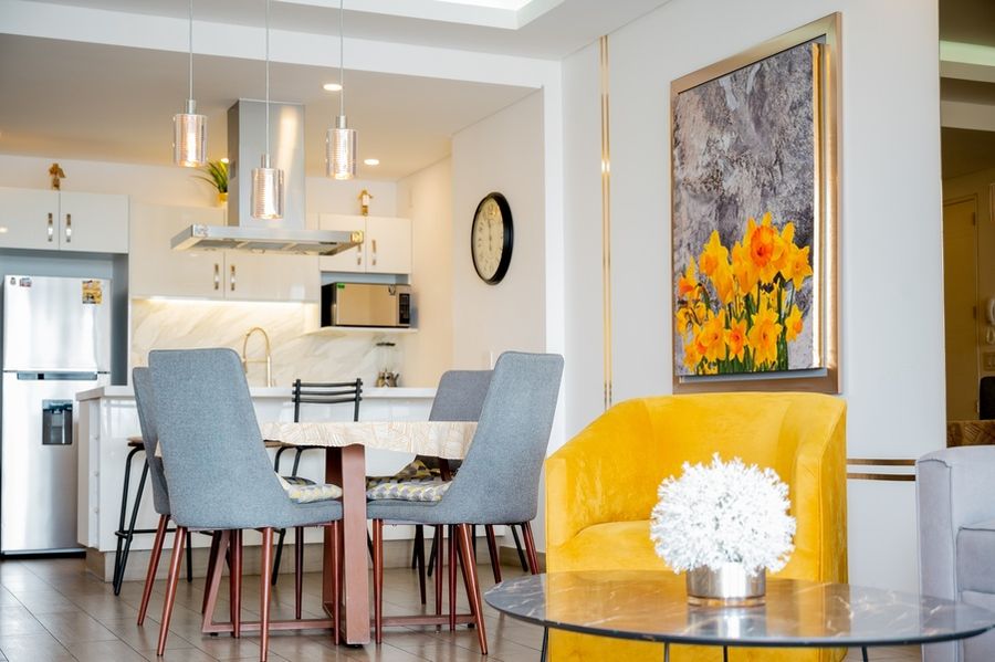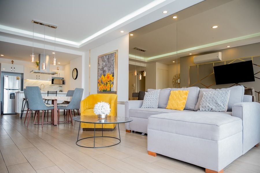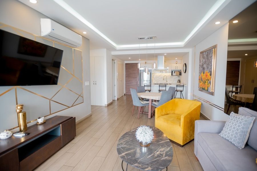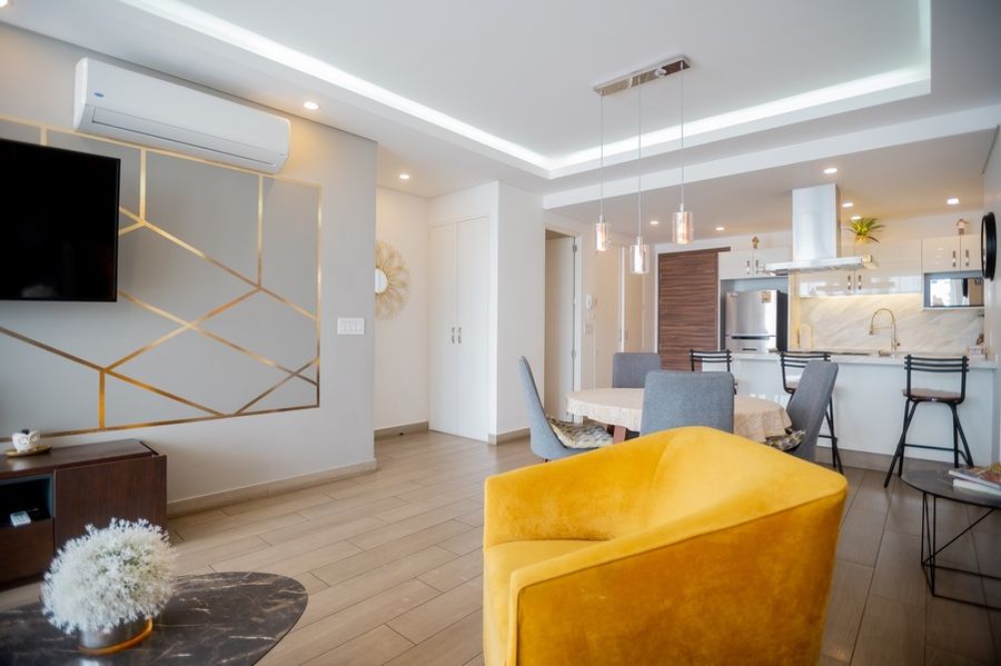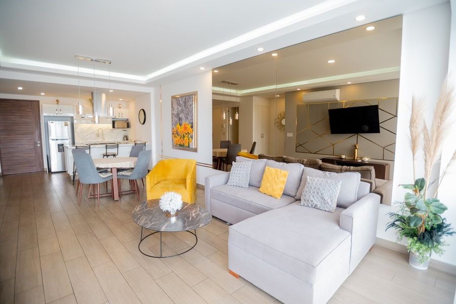 Discover this chic apartment in a great area. Enjoy a modern, open-concept layout with a sleek kitchen featuring white cabinetry, stainless steel appliances, and a neolith backsplash. The dining area features a round table with blue upholstered chairs, complemented by a stylish living space with a light grey sectional sofa, yellow accents, and a coffee table. Contemporary pendant lights illuminate the space, leading to a comfy bedroom with a king-size bed and a luxury walk-in shower.