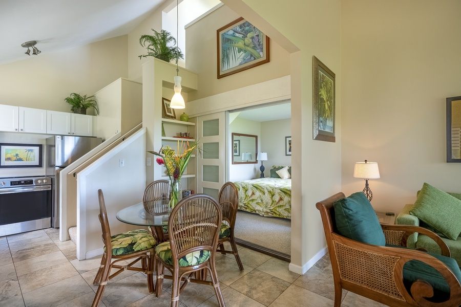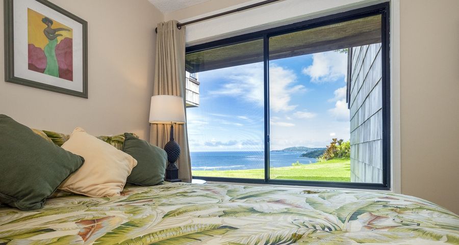 Sealodge J1: This Sealodge Kauai condo is private, quiet and serene with oceanfront views all the way down the Anini Reef to the Kilauea lighthouse. On the edge of the bluff between the trees and the ocean, this condo sits alone almost like a separate little house, facing the sea. Because of its location and blackout drapes, J1 stays cooler than most other Sealodge vacation rentals during the warmer days of the year. No other unit above, so you'll never hear any upstairs guests walking around! Enjoy breathtaking sun rises from the lanai and both bedrooms. This is a ground floor unit with the second bedroom and bathroom upstairs. Ocean views from every room. The downstairs bedroom has a king size bed and en suite bathroom, with an accordion door you can close to provide privacy from the living area. The upstairs bedroom includes a queen size bed, and is loft style, with a half wall open the the living room below. There is also a punee (single bed) in the in the living room facing the ocean. Free long distance phone. Full-size washer and dryer. Large (50"") smart TV in living room.