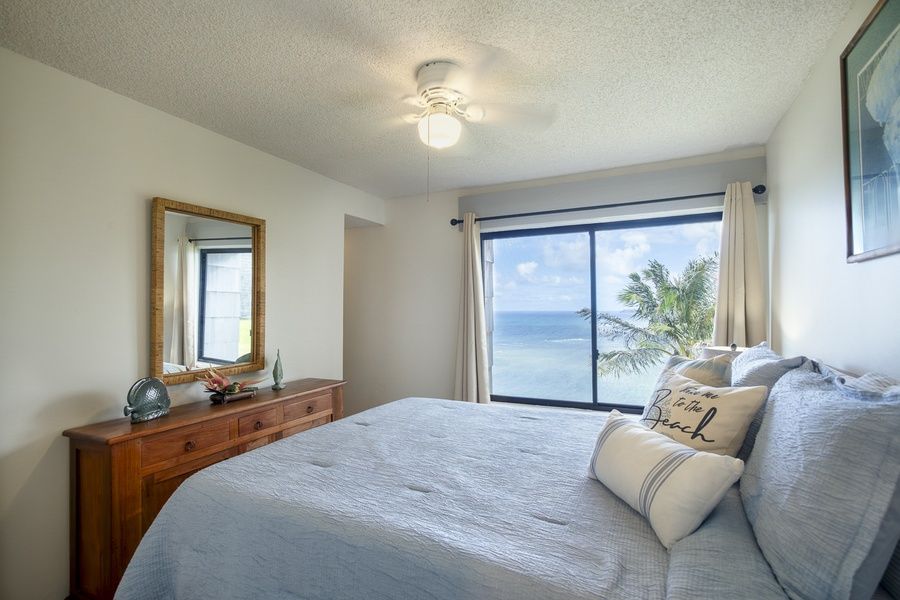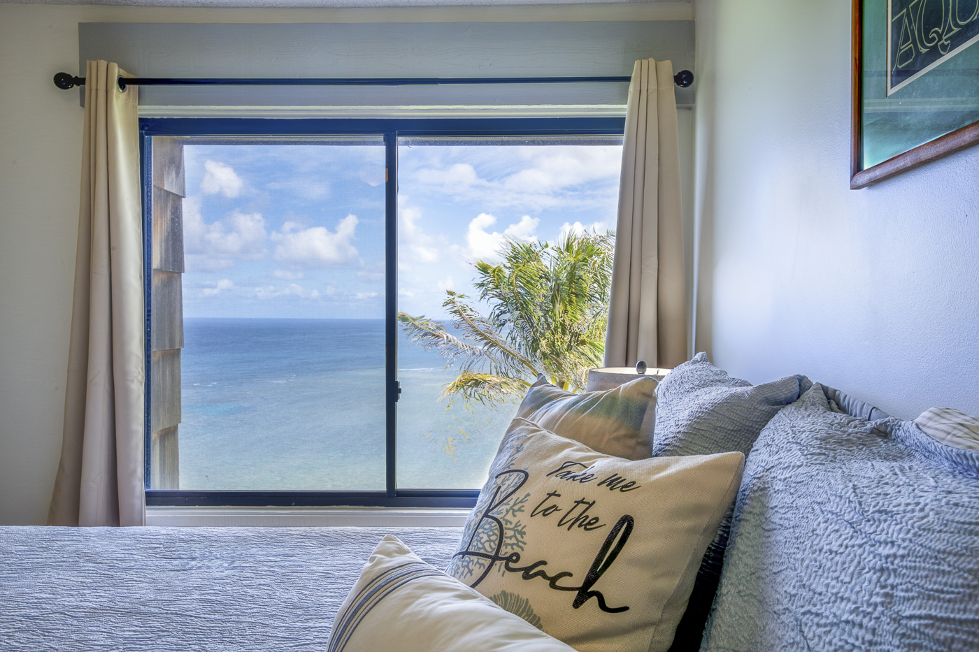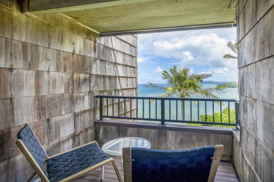 Sealodge E7 - cozy retreat for two with the most amazing view all the way down the coast to the lighthouse at Kilauea. This oceanfront retreat in the quiet Sealodge Princeville complex lets you see and hear the ocean, plus free wifi if it's a working vacation.