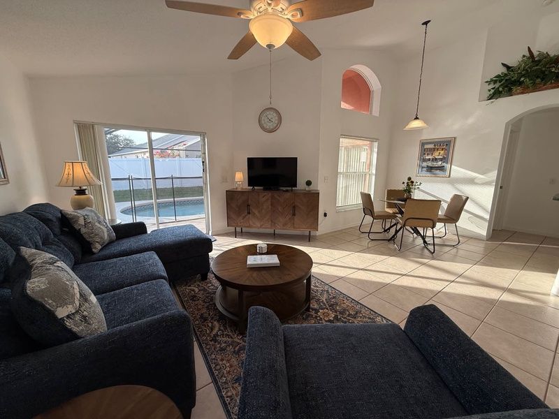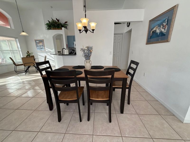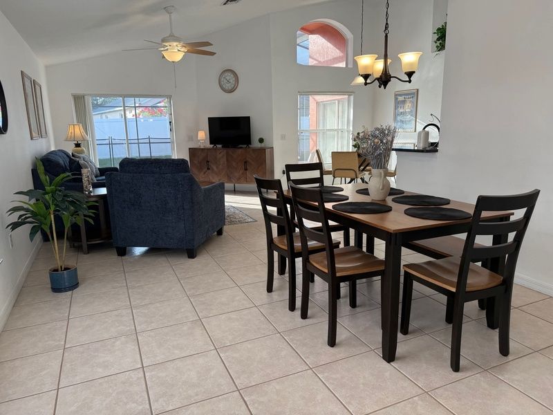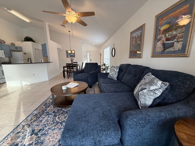 Well appointed 4 bedroom, 2 bathroom home located on quiet street in Southern Dunes. This is a great area to walk the community and convenient to the community sidewalks. A short walk up to the club house and restaurant. If you are looking for privacy by the pool this home has it! The large pool deck with new pool furniture will give you plenty of sunshine! Plenty of space to relax while visiting Central Florida.