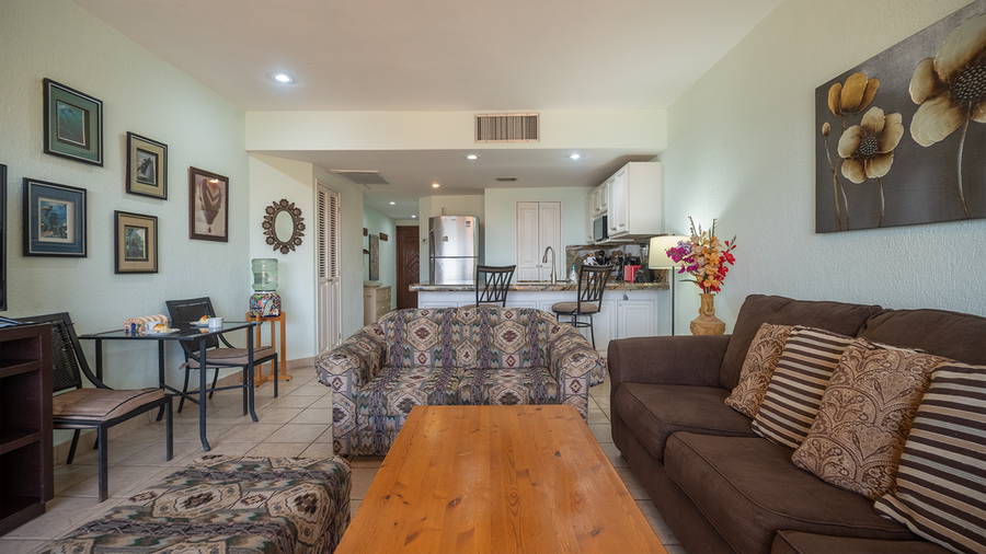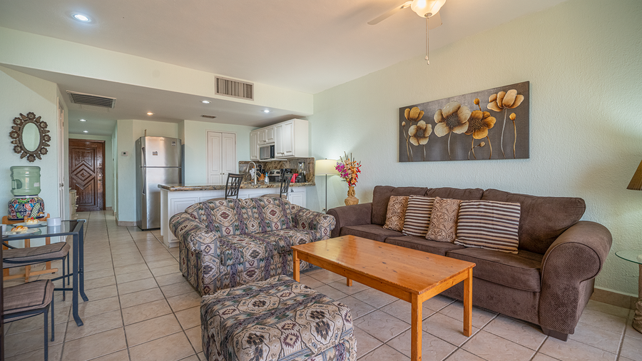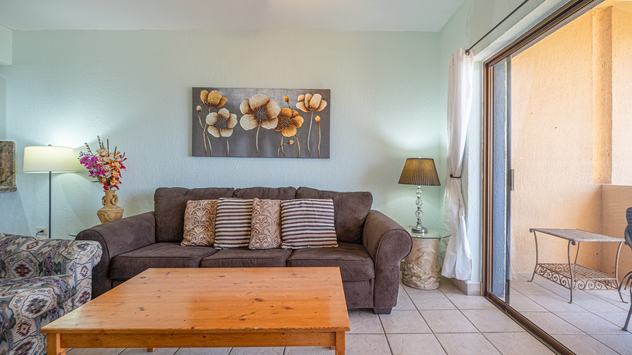 This is a 1 bedroom and 1 bathroom condo on the 5th floor of the B Tower. This condo has an ocean view and accommodations for up to 4 guests. The living room of the condo has 2 geometric patterned sofas in green and red with a matching red floor lamp and dark teak wood coffee table. The wall above the sofa has a wall mounted gold sun shaped mirror that really brightens up the room. There is a matching ottoman near the sliding glass arcadia doors that open to the terrace and a media unit on the opposite wall.