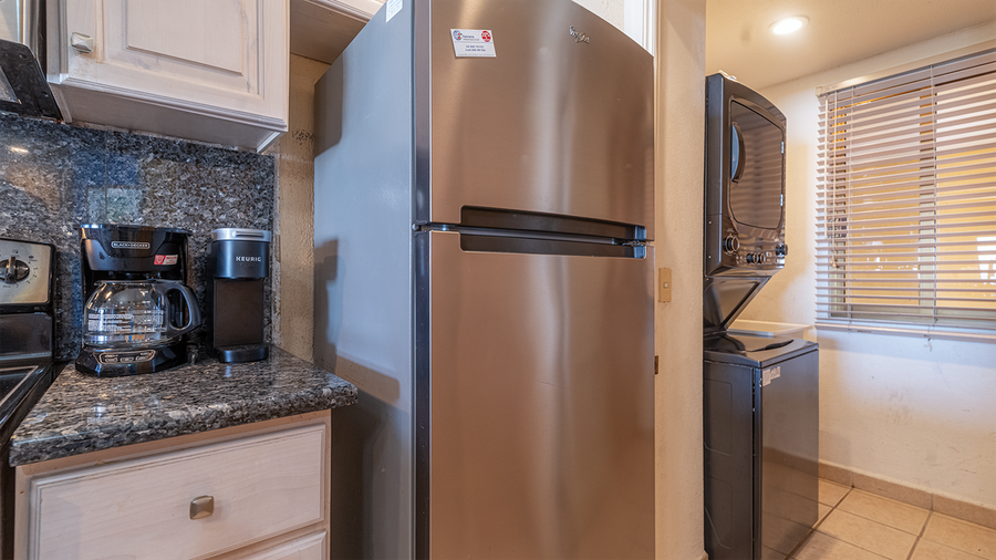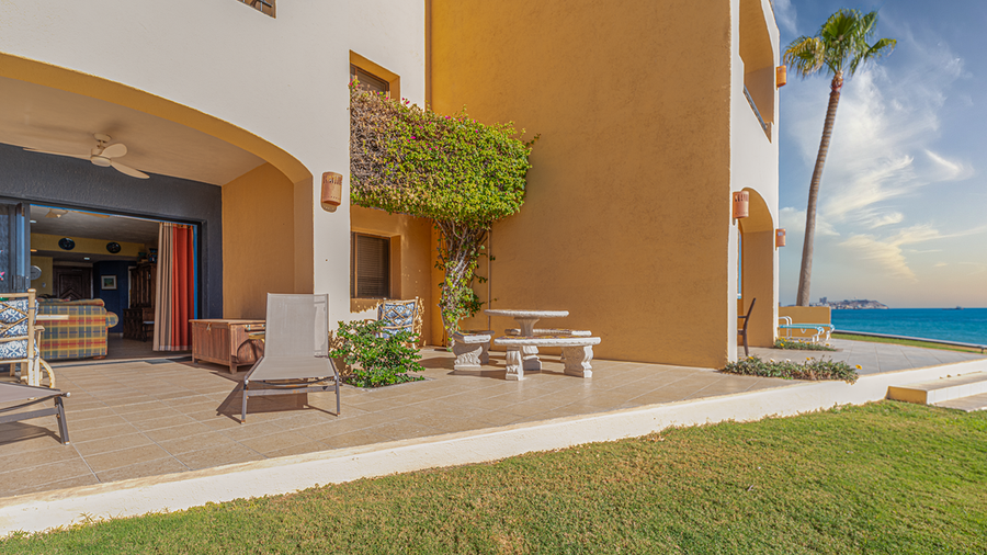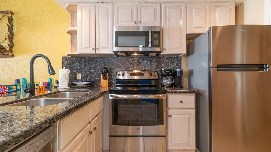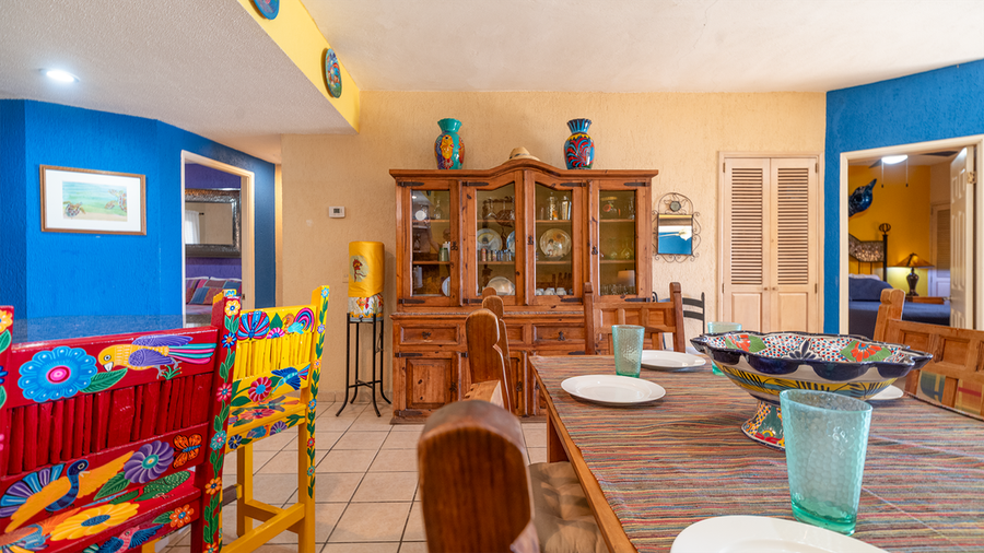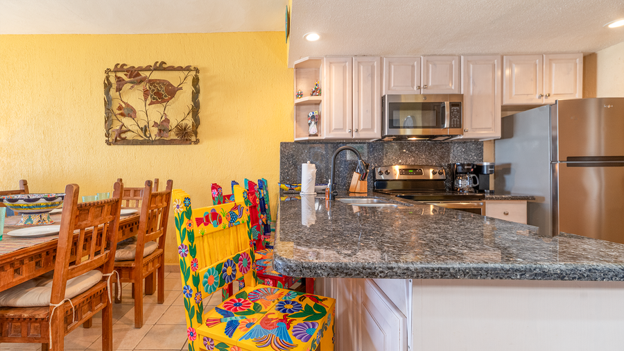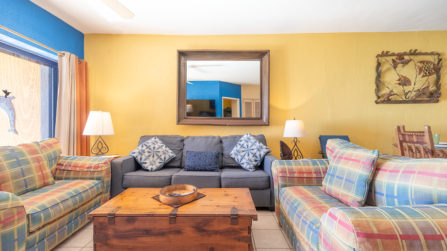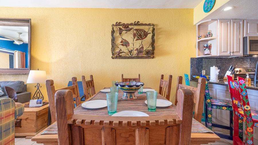This unit has two bedrooms and two bathrooms, it is a ground floor unit on the E building which is Ocean Front. Coming into the living room of this unit you will notice the southwest feel ot it with the furniture. A set of 3 sofas in beautiful blue shades and south west prints. There are light wood side tables which hold black lamps. In this room you will find a large flat screen TV with HBO and Tucson channels. There is satelite TV as well and for your comfort we also have high speed internet and wifi. The huge patio is just a few steps away, you only have to cross the sliding doors right at the living room. The dining room keeps with the theme with a beautiful dining set which consists of a rectangular wood table and sits for 6 people. There is also a mirror with a stylish metal frame. You will also find a china cabinet with a lot of serving pieces. The kitchen is fully equipped in it you will find all you need to prepare a fantastic meal, just bring the groceries and you will not have trouble finding the basics. You will have all the most important appliances that you would need, to cook.