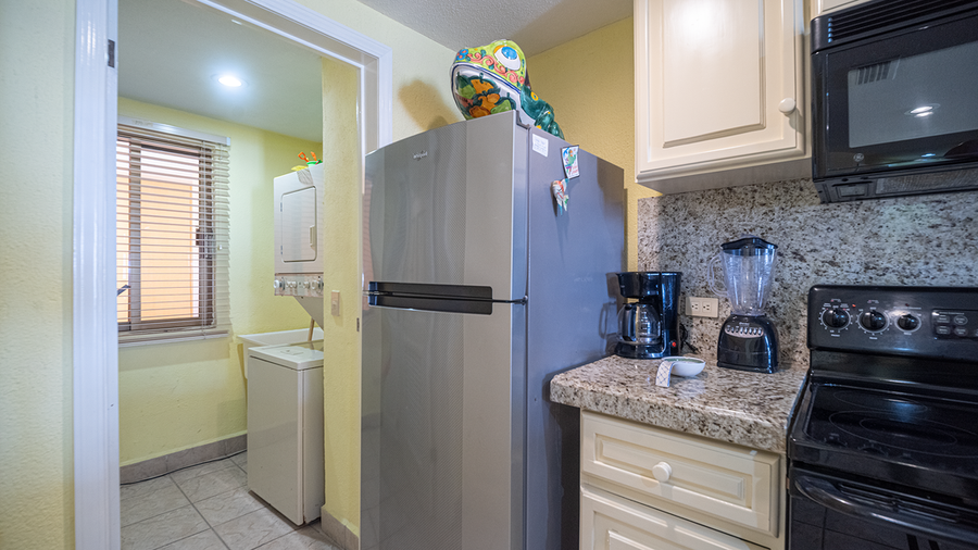 The main open living area houses the kitchen, dining, and living room. There is access to the patio through double sliding glass doors. The dining table, and the living room furnishings are earth tone shades of wood, with plush, oversized sofas. There is internet access, TV and DVD combination, and an L shaped granite countertop here as well. Double stainless steel sink, stove, fridge, and microwave.