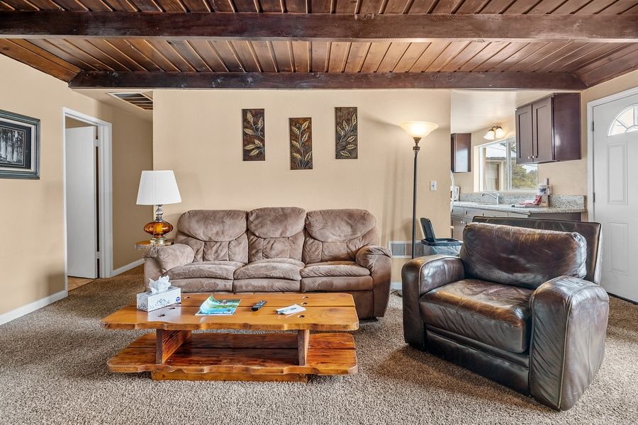 LIVING SPACE - Cozy 900+ sq ft home with living room, dining table, bar seating, smart TV, beautiful wood burning fireplace, and plenty of comfortable living room seating.