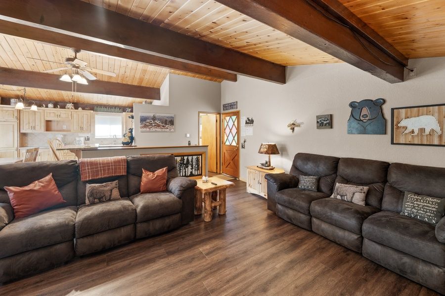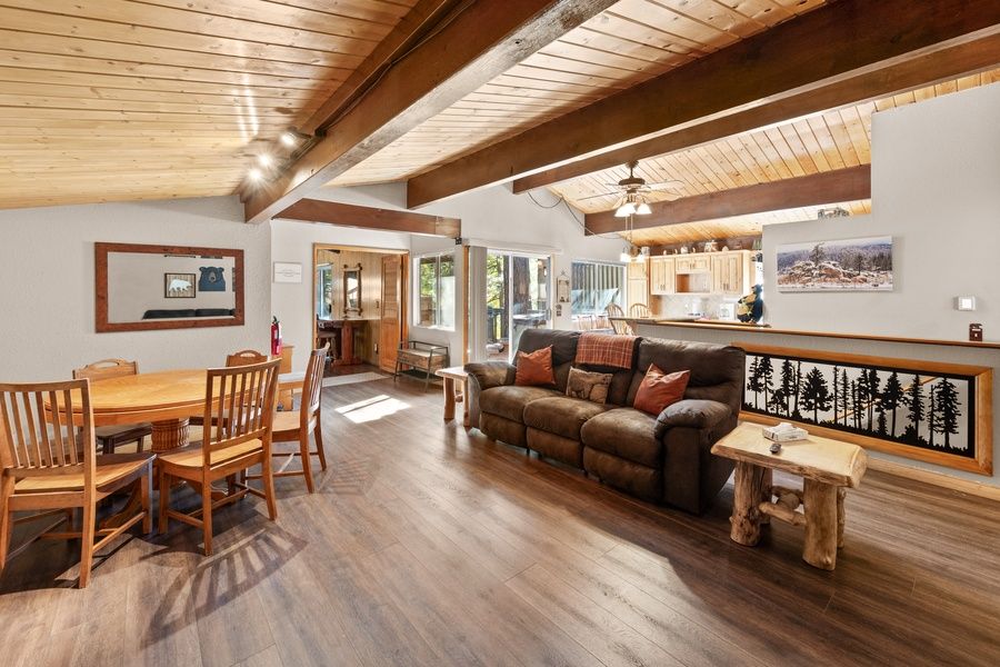 Beautiful Moonridge home nestled among lush greenery. Featuring vaulted wood ceilings and rustic Big Bear charm throughout the cabin. Spacious, open floor plan perfect for hosting family and friends. Nearby the Alpine Zoo, National Forest hiking trails, and local eatery. Conveniently located between both ski resorts. Just a short drive to the lake, Village, Snow Play, Convention Center and more!