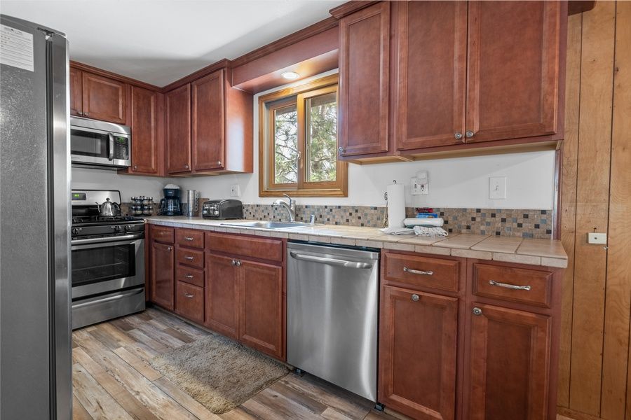 KITCHEN - Remodeled kitchen, stainless steel appliances, stove, oven, double door refrigerator, dishwasher, microwave, blender, toaster, coffee maker, crockpot, rice cooker, pots/pans, spices, and more.