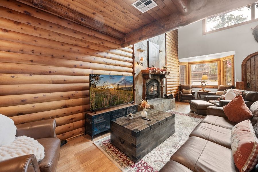 LIVING SPACE - Spacious 3200+ sq ft home with living room, game room, cinema room, ceiling fans, dining table, bar seating, TV, beautiful wood-burning fireplaces, and plenty of comfortable living room seating.