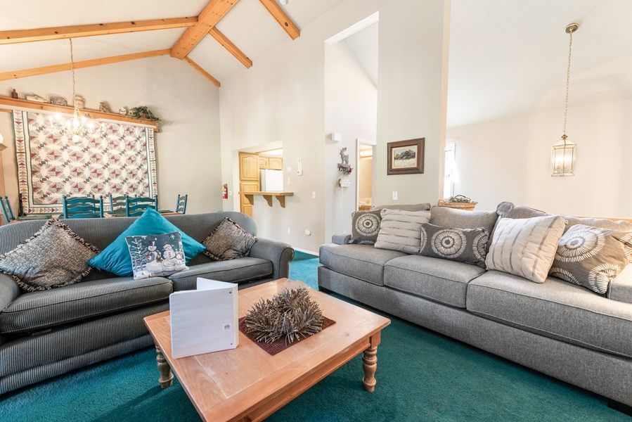 LIVING SPACE - Spacious 1400+ sq ft home with living room, TV, dining table, a beautiful wood burning fireplace, and plenty of comfortable living room seating.