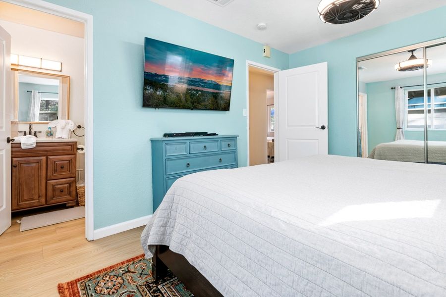 ROOMS & BEDS - 3 bedroom, 2 bath. Master bedroom has a king bed, USB ports on headboard, smart TV with cable, Blu-ray player, and private bath. Second bedroom has a queen bed, cable TV and Blu-ray player. Third bedroom has a full/twin bunk bed, cable TV, and Blu-ray player. Extra blankets and pillows are available.
