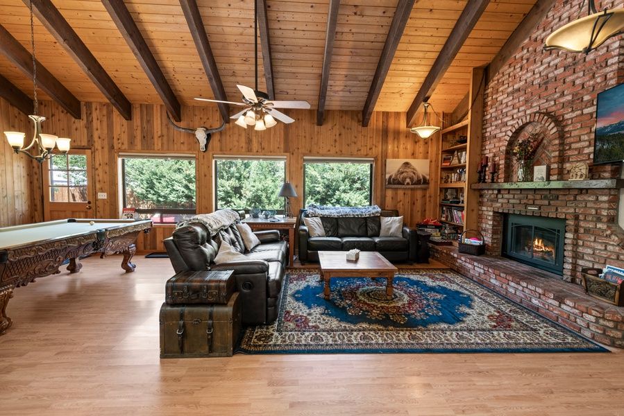 LIVING SPACE - Spacious 2570+ sq ft home with cathedral exposed beam ceilings in the living room, ceiling fans, dining table, a beautiful gas log fireplace, and plenty of comfortable living room seating.