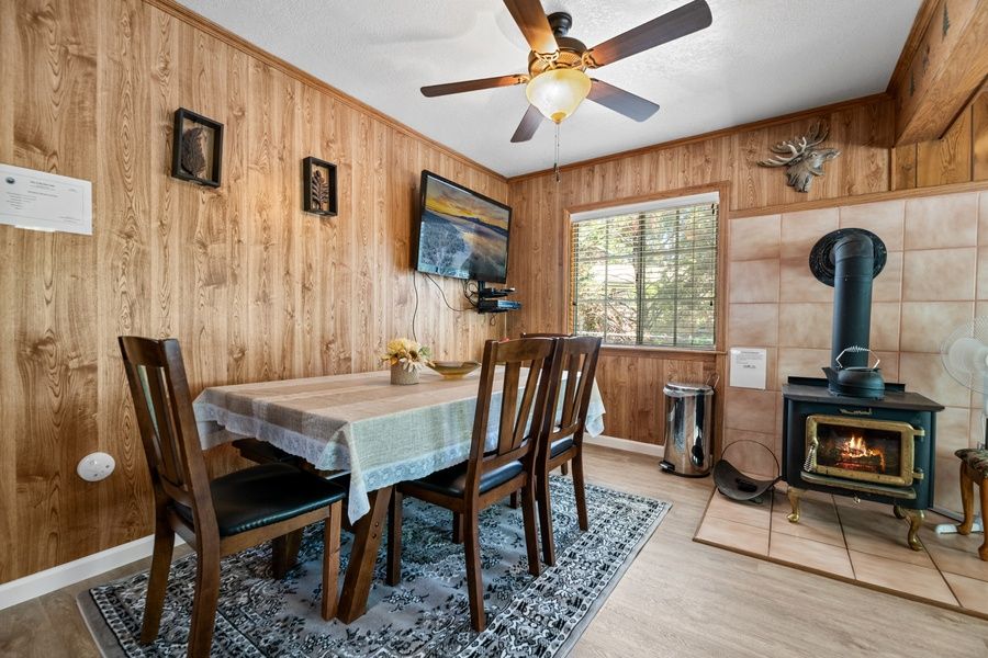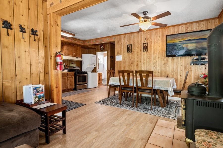 LIVING SPACE - Comfortable 800+ sq ft home with living room, smart TV, ceiling fans, dining table, and a wood burning stove fireplace. Cuddle up on the sectional with plenty of comfortable living room seating.