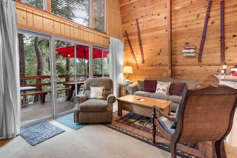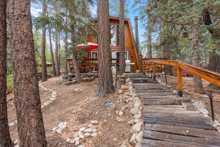 Beautiful A-frame cabin with high ceilings, hardwood floors, wood siding, large windows, and sliding glass doors. Walking distance to Bear Mountain Ski Resort and the golf course. Nearby Alpine Zoo, National Forest hiking trails, and more. Just a short drive to the lake, Village, Snow Play, Convention Center and more! This gorgeous home with breathtaking forest views awaits your next mountain getaway!
