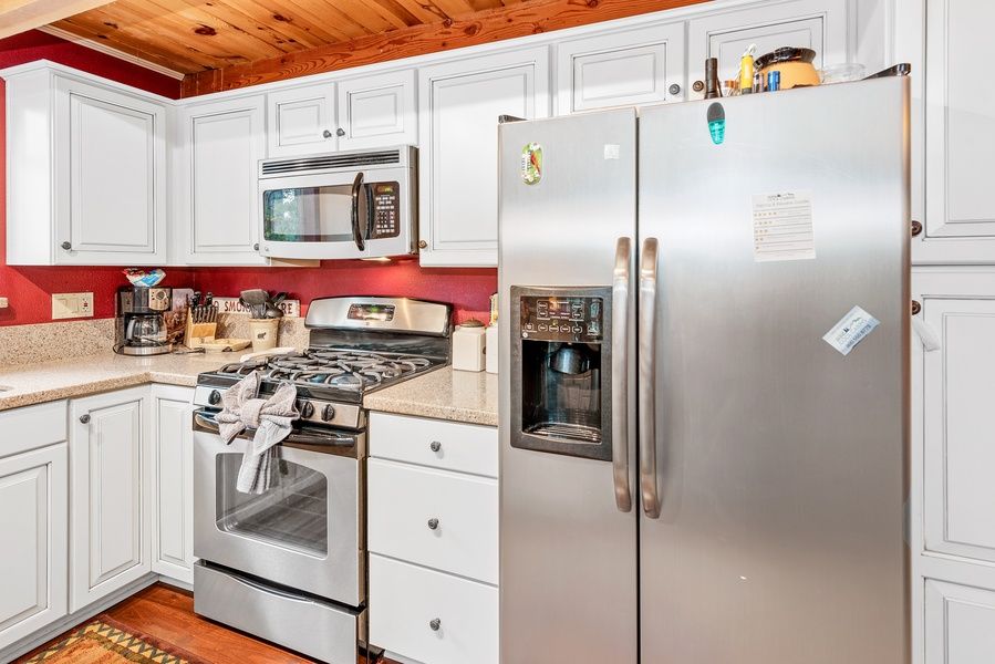 KITCHEN - Full kitchen with stove/oven, double door refrigerator with water and ice dispenser, dishwasher, microwave, blender, toaster, coffee maker, dishes, pots/pans, spices, and more.