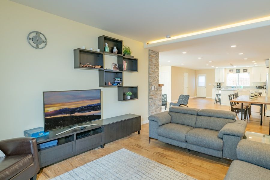 LIVING SPACE - Spacious 2100+ sq ft home with living room, TV, ceiling fan, dining table, bar seating, a beautiful gas fireplace, and plenty of comfortable living room seating.
