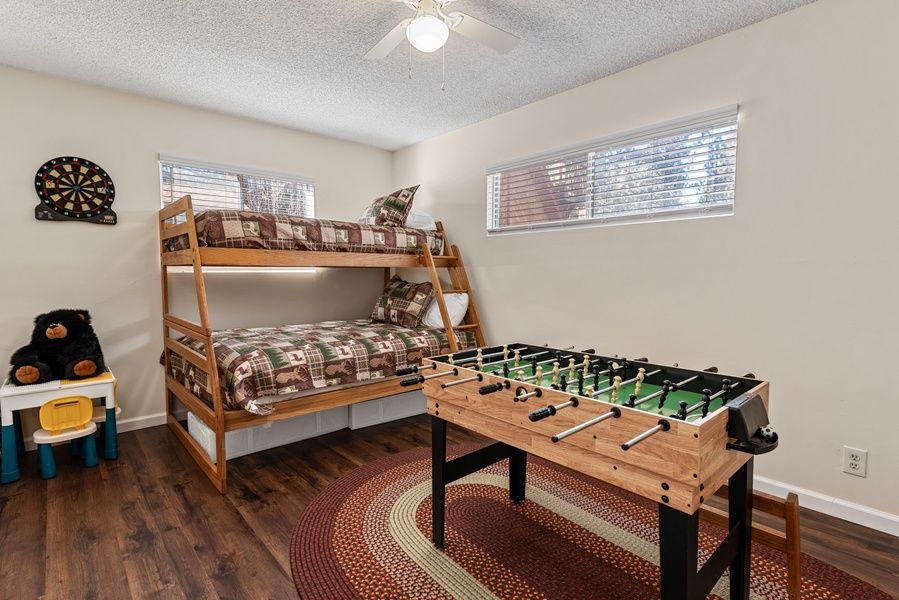 ROOMS & BEDS - 4 bedroom, 2 bath. Upstairs first bedroom is inspired by Bear Mountain Ski Resort and has a king bed and smart TV. Upstairs second bedroom is inspired by Windy Point Fishing Hole and has 2 queen beds. Downstairs third bedroom is inspired by the Pine Knot Trail and has a queen bed and smart TV. Downstairs fourth bedroom is inspired by the Big Bear Alpine Zoo and has a double/twin bunk with trundle and smart TV. Extra blankets and pillows are available.