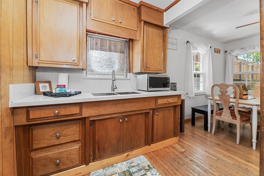 LIVING SPACE - Comfortable 800+ sq ft home with beautiful real wood floors throughout. This property features a smart TV, dining table, ceiling fans, and a living room with lift top coffee table and charming wood burning stove fireplace. Guests will enjoy plenty of inviting living room seating.