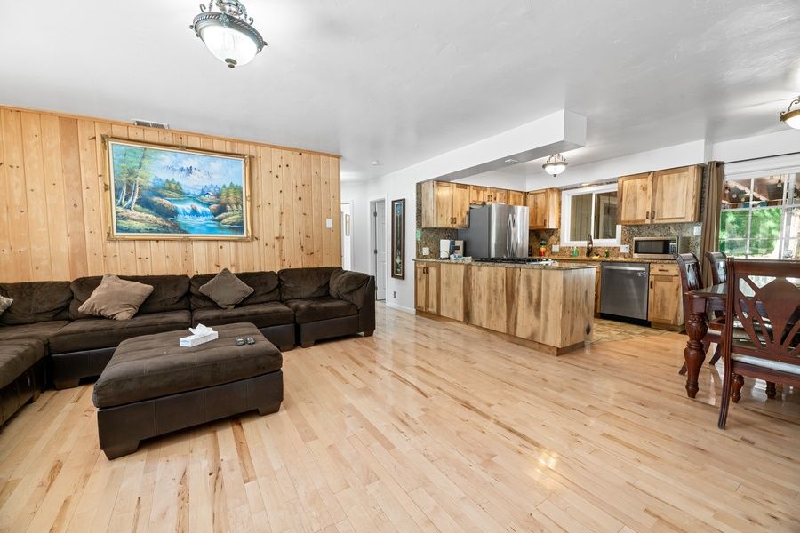 LIVING SPACE - Spacious 1580+ sq ft home with living room, TV, dining table, wood burning stove fireplace, and plenty of comfortable living room seating.