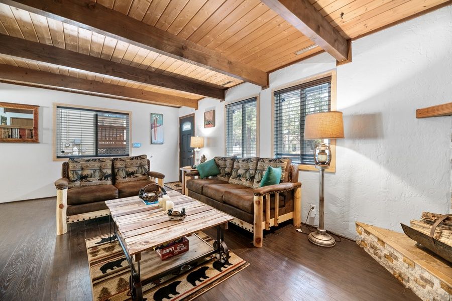 LIVING SPACE - Spacious 1300+ sq ft home with living room, game room with bar, dining table, bar seating, smart TV, a beautiful wood burning fireplace, and plenty of comfortable living room seating.
