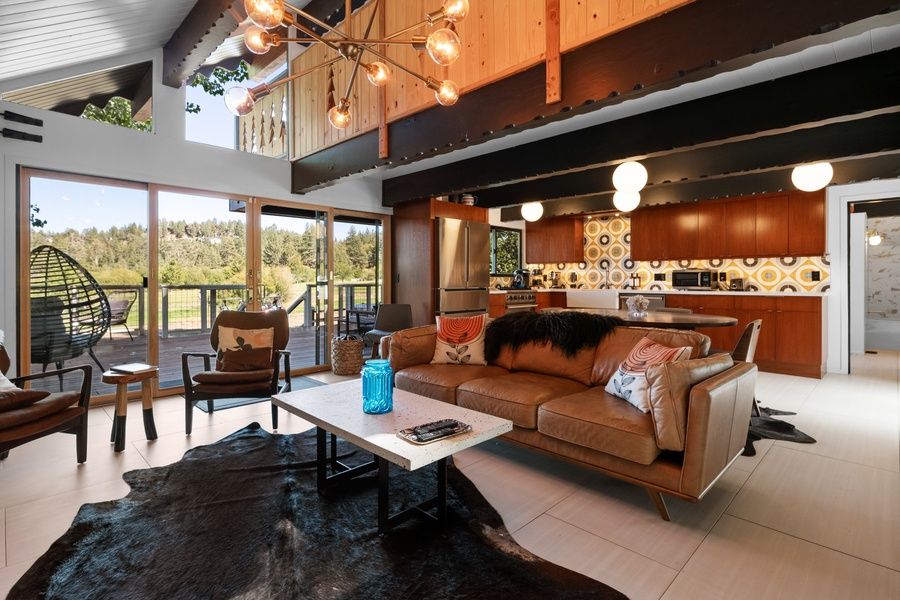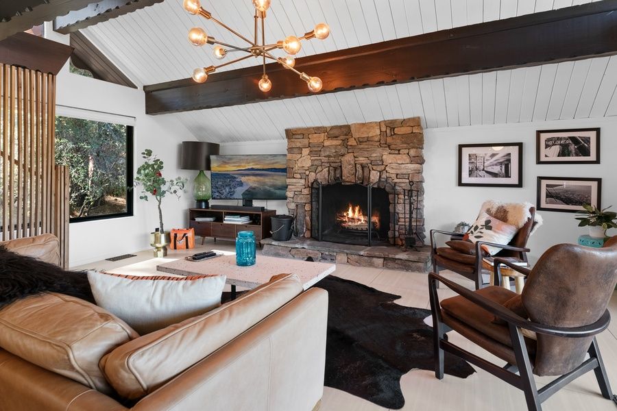 LIVING SPACE - Spacious 1100+ sq ft home with living room, smart TV with Apple TV, dining table, beautiful wood burning fireplace, air purifier, and plenty of comfortable living room seating.