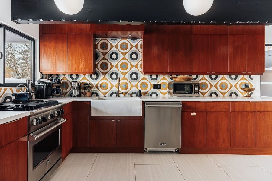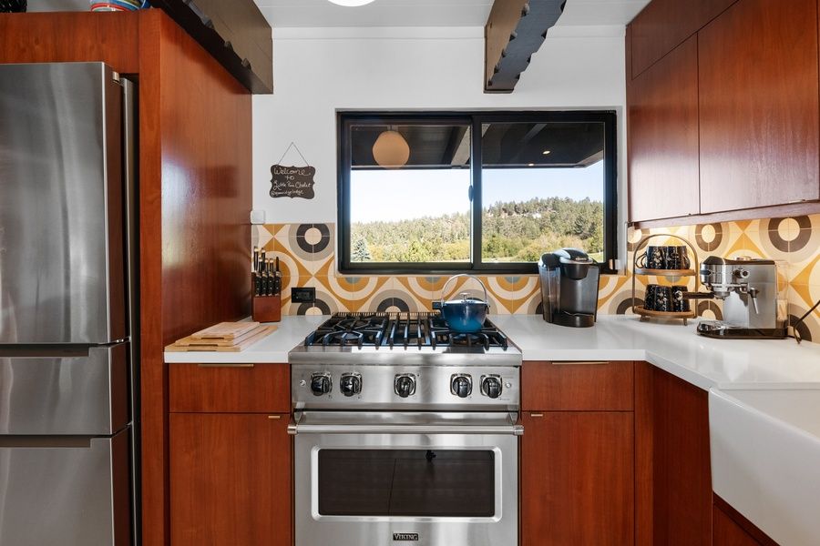 KITCHEN - Custom built walnut kitchen cabinets with quartz counter tops, stainless steel appliances, Viking range, subzero style refrigerator, dishwasher, microwave, blender, toaster, coffee maker, dishes, pots/pans, spices, and more.