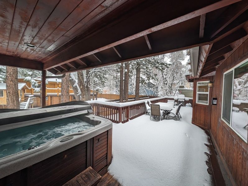 OUTDOORS - Enjoy the large back deck with hot tub, patio furniture, and gas barbecue. fenced backyard. For those who like to mountain bike, Snow Summit offers access to its trails via chairlift during the summer. You can also ride your bike to the lake, which is just a mile away.