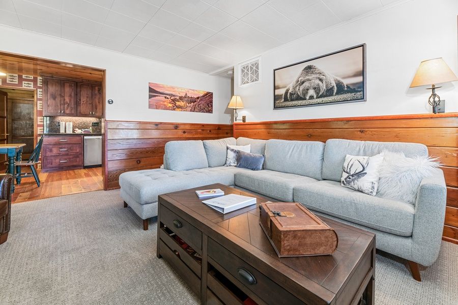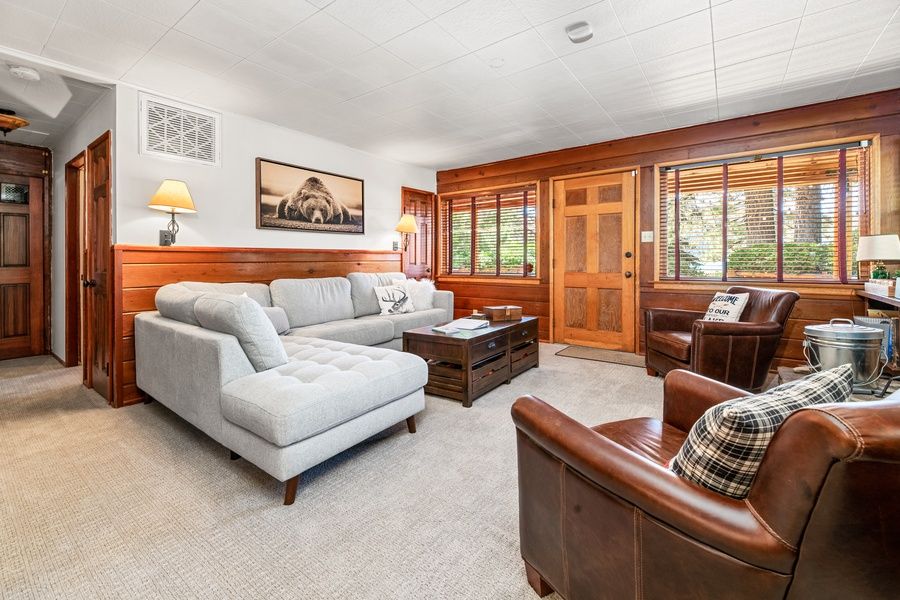 LIVING SPACE - Spacious 1000+ sq ft home with living room, TV, dining table, beautiful wood burning fireplace, and plenty of comfortable living room seating.
