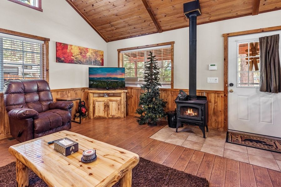 LIVING SPACE – Comfy 1000+ sq ft home with living room, smart TV, ceiling fans, bar seating, dining table, wood stove fireplace, and plenty of comfortable living room seating.