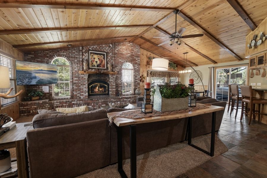 LIVING SPACE - Spacious 2400 sq ft home with living room, TV, ceiling fans, dining table, bar seating, a beautiful wood burning fireplace, and plenty of comfortable living room seating.