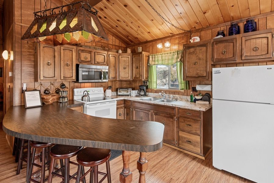 KITCHEN - Full kitchen with electric stove, oven, refrigerator, microwave, blender, toaster, coffee maker, dishes, pots/pans, spices, and more.