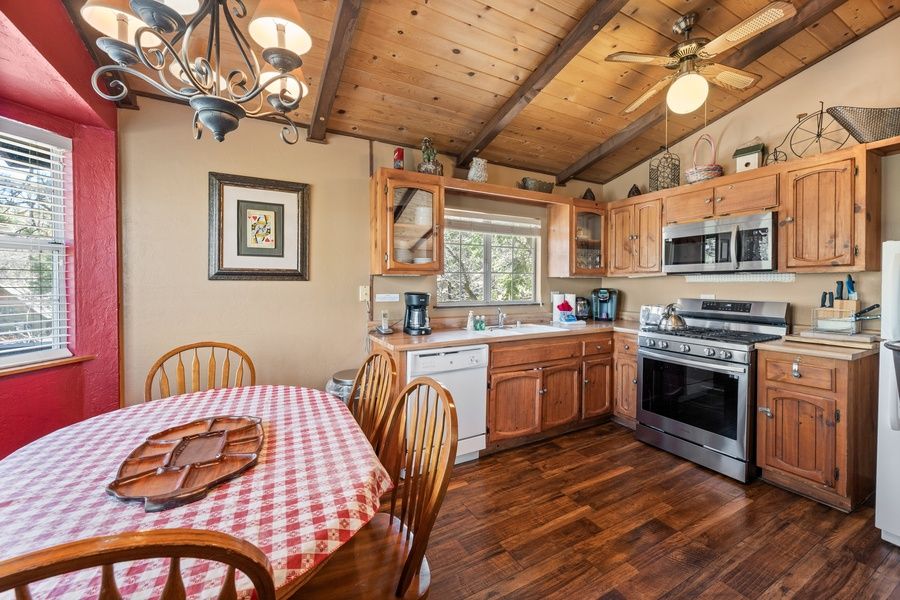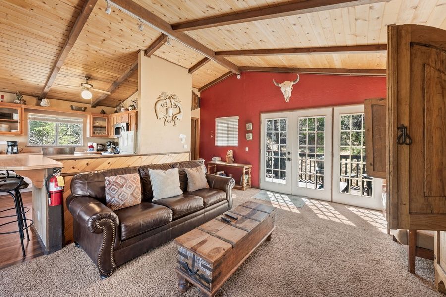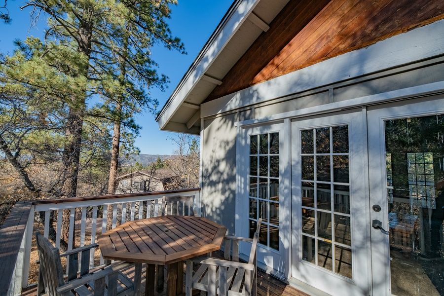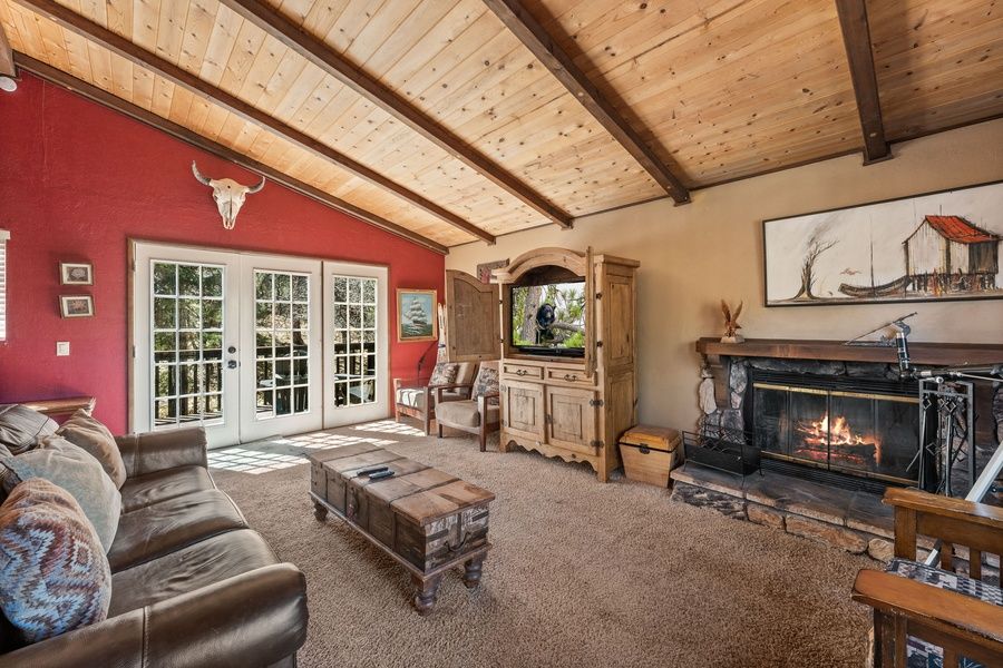 Nestled in the trees in the private serene setting of Moonridge, this beautiful two-story chalet awaits your next mountain getaway. Accented with wood ceilings and French doors, this cabin provides a cozy and comfortable home away from home! The large lot also has the perfect slope great for snow sledding in the Winter! Nearby Bear Mountain Ski Resort, golf course, Alpine Zoo and hiking trails. Just a short drive to the lake, Village, Snow Play, Convention Center and more!