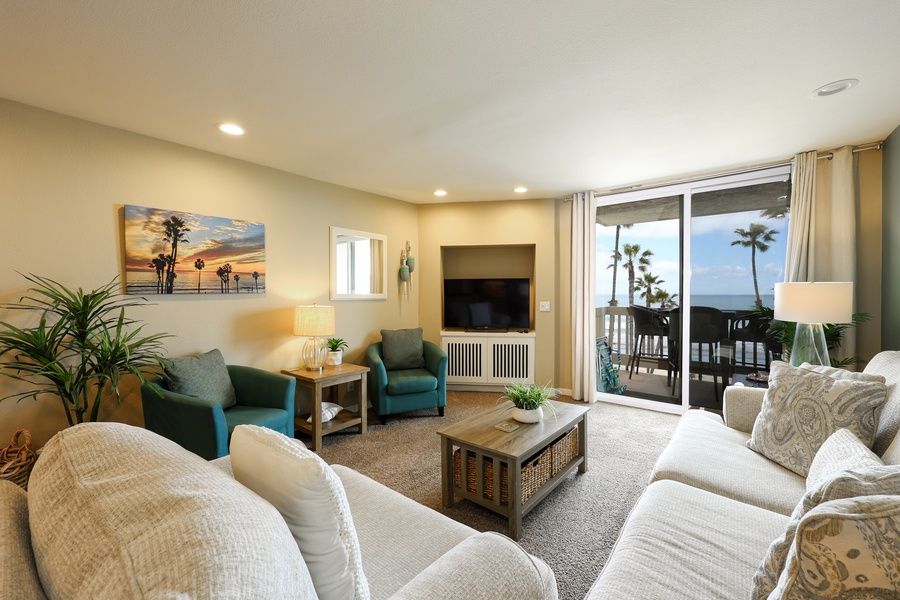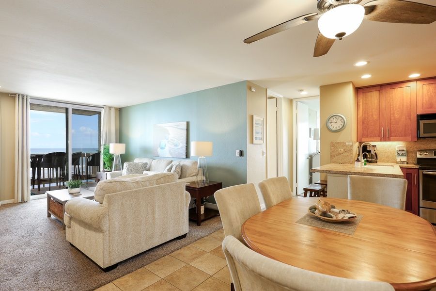 As you step inside, you are greeted by the panoramic ocean views from the living room and balcony. The living room has ample seating with 2 chairs, a love seat, and a comfortable sofa.