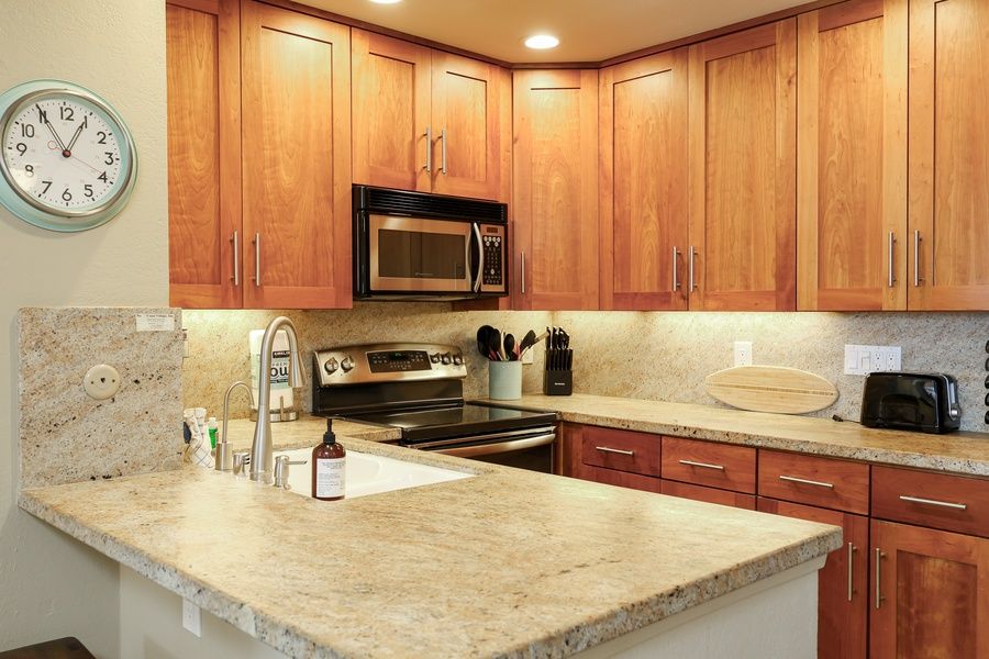 The modern kitchen is a chef's dream, equipped with stainless steel appliances, granite countertops, and ample storage. A kitchen bar provides a casual dining option, while the adjacent dining area offers a lovely space for family meals, with ocean views enhancing every bite.