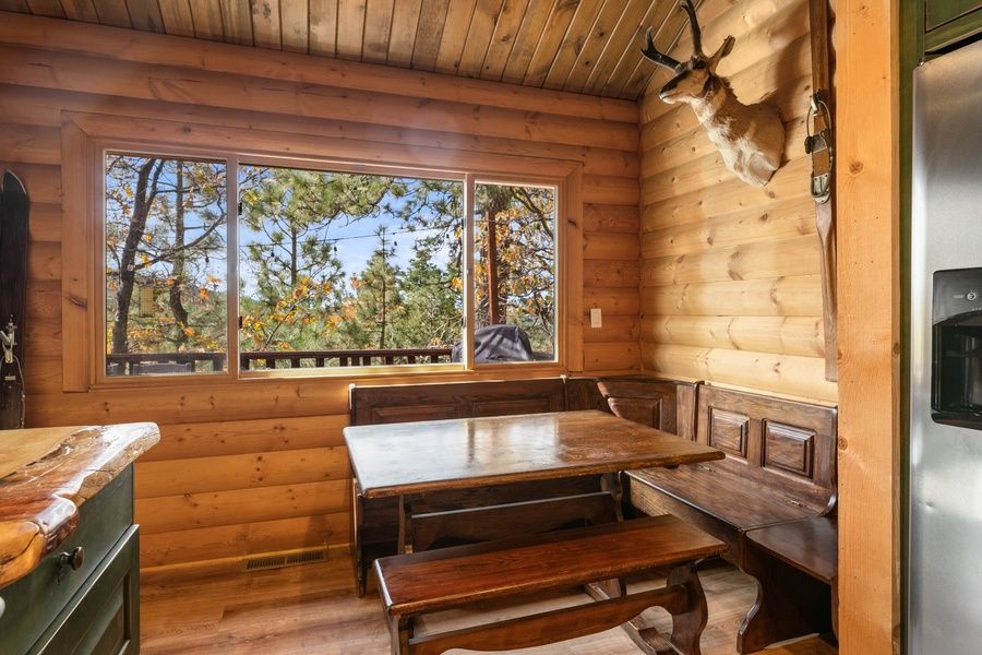 . Beamed ceilings in the living room and lovely treetop views from living room and kitchen. Just a short drive to Bear Mountain Ski Resort, the lake, Village, and National Forest hiking trails.