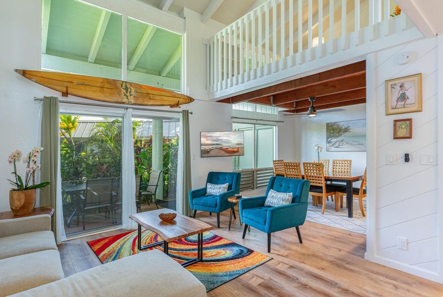 If you're looking for a chic, carefully put together retreat that'll make you feel right at home, Puamana 26B is the place for you! This two-story island townhouse has two comfortably furnished bedrooms, with a queen bed downstairs and a king in the upstairs loft, and a full-sized sleeper sofa in the living room. The living room is cozy and inviting, with colorful island touches throughout, and the second sitting area upstairs is perfect for curling up with a book or letting kids have their own space to hangout. You also have two private lanais to enjoy: one downstairs with a dining area for 6, and one upstairs with gorgeous views of waterfalls tumbling down the mountains!