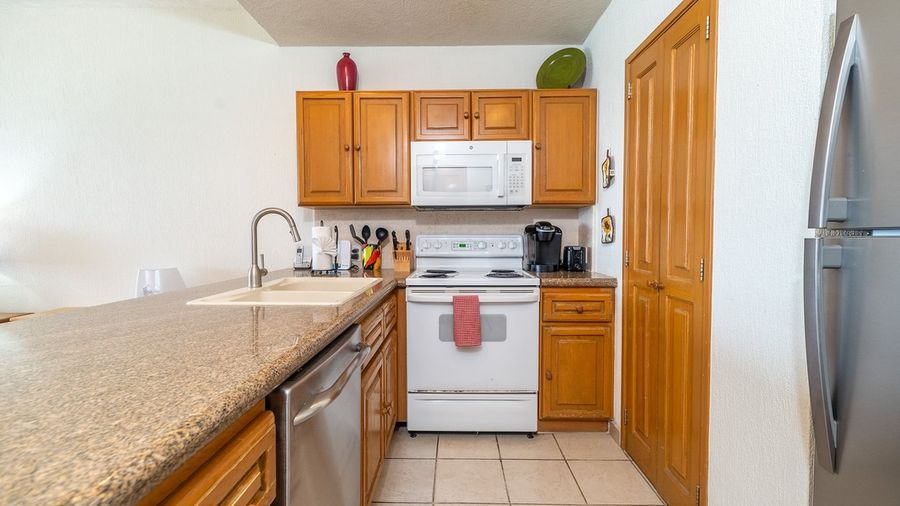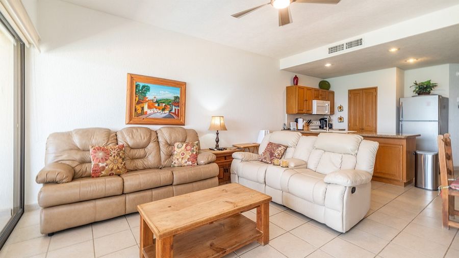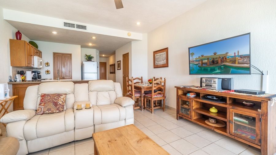 A 1 bedroom with a King bed in the bedroom and a comfortable sectional sofa in the main room. Needed touches include a full kitchen, TV and DVD player, and an excellent patio that floats above the beach. The kitchen is small but complete. A nice comfortable place to enjoy a weekend getaway in Rocky Point.