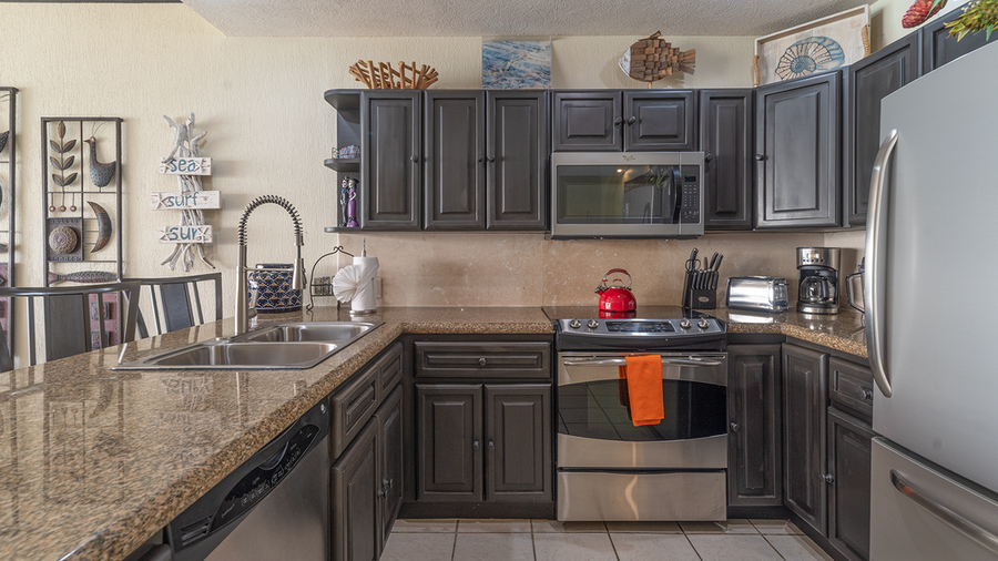 Pools line the beach, and your very large patio hovers over it all. The kitchen is comfortable to work in, and the condo is decorated throughout with fine rustic furnishings and touches of the tropics. Think Tommy Bahama! The resort amenities are complete and accessible to town is easy, with everything nearby. Some things that are within walking distance include;