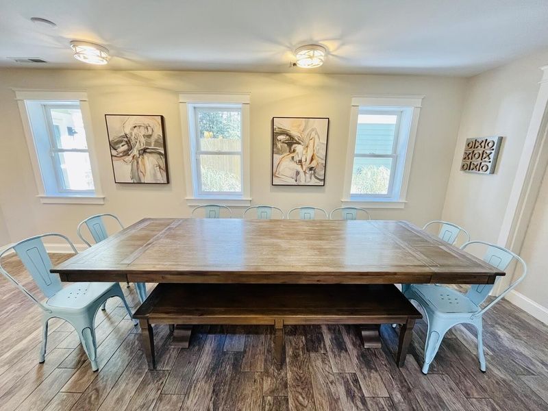 Welcome to this LARGE and very private retreat at the beach with a spacious outdoor area and plenty of indoor accommodations! This property features two buildings that can accommodate up to 14 people total. The main house includes 5 BR / 2.5BA, updated kitchen, and two 1st floor bedrooms. The second floor offers two attached queen bedrooms with one entry door and the remaining primary queen bedroom. The other building features two additional bedrooms with a full bathroom, kitchen, living area, and another separate washer/dryer. There is a large outdoor area that includes a wet bar, picnic tables, fire pit, half basketball court, and even a walking trail surrounding the property. You are located down the road from Bear Trap Dunes where you can play a round of golf or drive just a few miles to the beach, restaurants, and more. Arrive with the beds already made and many household items included. Make this your next destination and inquire today!