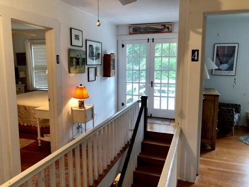 Old Rehoboth Charm - step back into the '20's with this 7 bedroom 4.5 bath home designed to bring the whole family. Large yard with adorable children's playhouse and hammock, etc. Massive wrap around screened porch. Living room has two portable AC units, 1st floor bedroom has a 2 twin beds and ensuite bath with tub and 1 AC unit, 2nd floor has a bedroom with 1 King bed and 1 AC unit, 1 Queen bed and 1 AC unit, 2 Twins and 1 AC unit, 2 Twins and 1 AC unit and hall bath with old clawfoot tub plus another hall 3/4 bath. 1/2 bath off laundry room on the 1st floor and enclosed outside shower. Detached garage apartment has 2 bedrooms on the 2nd floor, 1 with 2 twins and a set of bunks and the other with 1 double bed and a shared bath with a tub and central air conditioning.