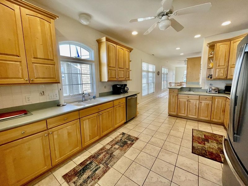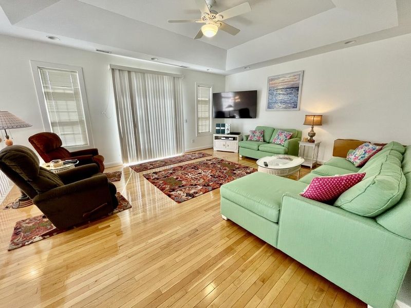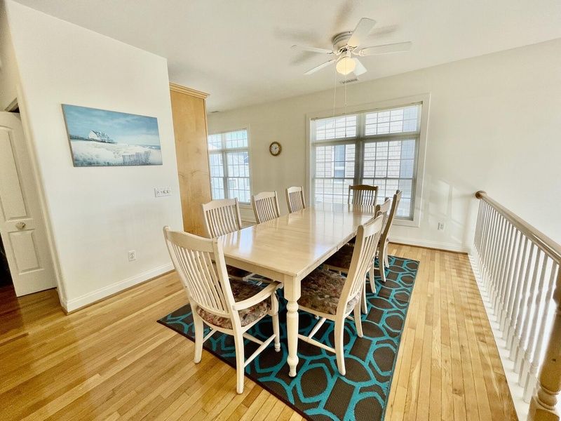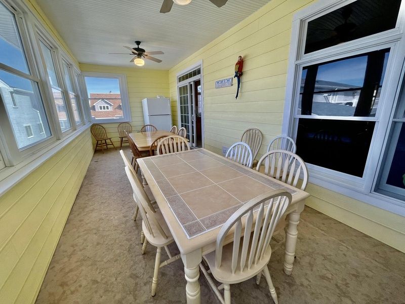 This beautifully maintained Ocean Block duplex is just the 5th property from the beach and designed with large families in mind! The many amenities include a large open living and dining area on the 3rd floor along with a spacious kitchen, sun porch for additional dining, powder room and an en suite bedroom and bath. The 2nd level features 4 bedrooms, including 1 that is en suite, 2 full hall bathrooms, a powder room, cozy den and relaxing sun porch. There are 2 refrigerators, 2 washer/dryers & 2 bbq grills, a refreshing outdoor shower, multiple decks and plenty of off street parking!